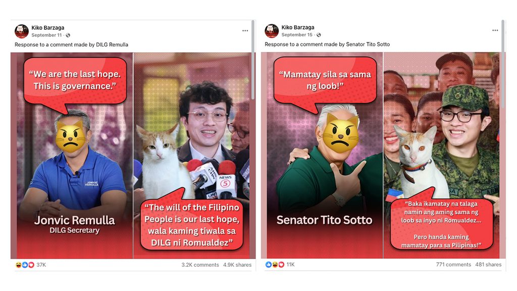 MANILA, Philippines – Neophyte congressman Kiko Barzaga has been on a shitposting spree. Within a month of leaving his political party, he shared over a hundred incendiary posts pitting himself against government officials — from the President to his colleagues in Congress. Cat emojis are layered over their faces, quotes stripped of context, and in one case, an AI image of Senate President Tito Sotto was even used.