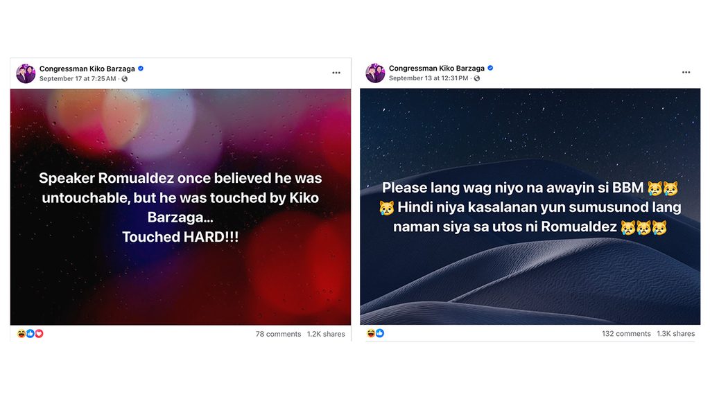 Posts from his verified profile have regularly performed better compared to his official page. In collaboration with data forensics firm The Nerve, we found that four out of six of Barzaga’s top-performing posts from September 2024 to September 2025 — or those that got above average shares, comments, and reactions — came from his verified profile.
